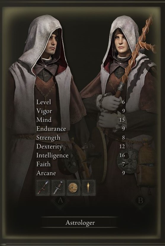 The Astrologer is Elden Ring’s version of a traditional mage class, and it has the highest Intelligence of any class. This class starts with an Astrologer’s Staff, a short sword, a small shield, Glintstone Pebble, Glinstone Arc, and light armor. This means you’ll have a few melee options but only consider these backups. The Astrologer class can cast several spells with ease but has significantly less health and stamina compared to other options.