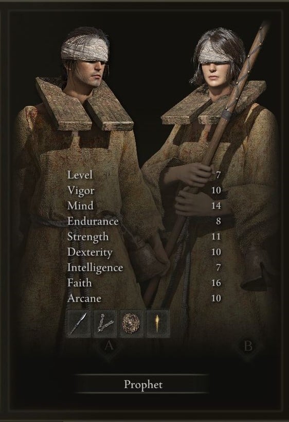 The Samurai is a unique class that starts with an Uchigatana, longbow, Red Thorn Roundshield, and medium armor. This class has the second-highest Dexterity stat behind the Warrior and comes equipped with a long-range weapon. Parrying is slightly more difficult with this class, and you won’t excel with magic in the early game. Consider the Samurai for a Dexterity-based build.