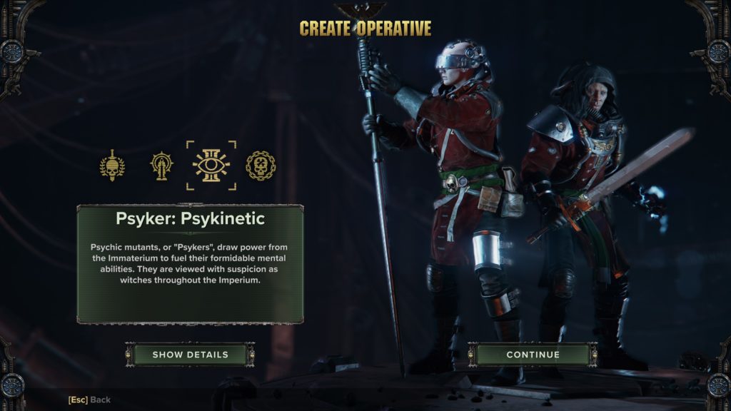 The Psyker Psykinetic is probably the most advanced class of the launch classes. It’s a magic-wielding class with area-of-effect attacks and big knockout blasts, but you can’t just spam your attacks without risking your Peril meter going to high and killing yourself. You can also make heads explode. Fun choice for experienced DPS players.