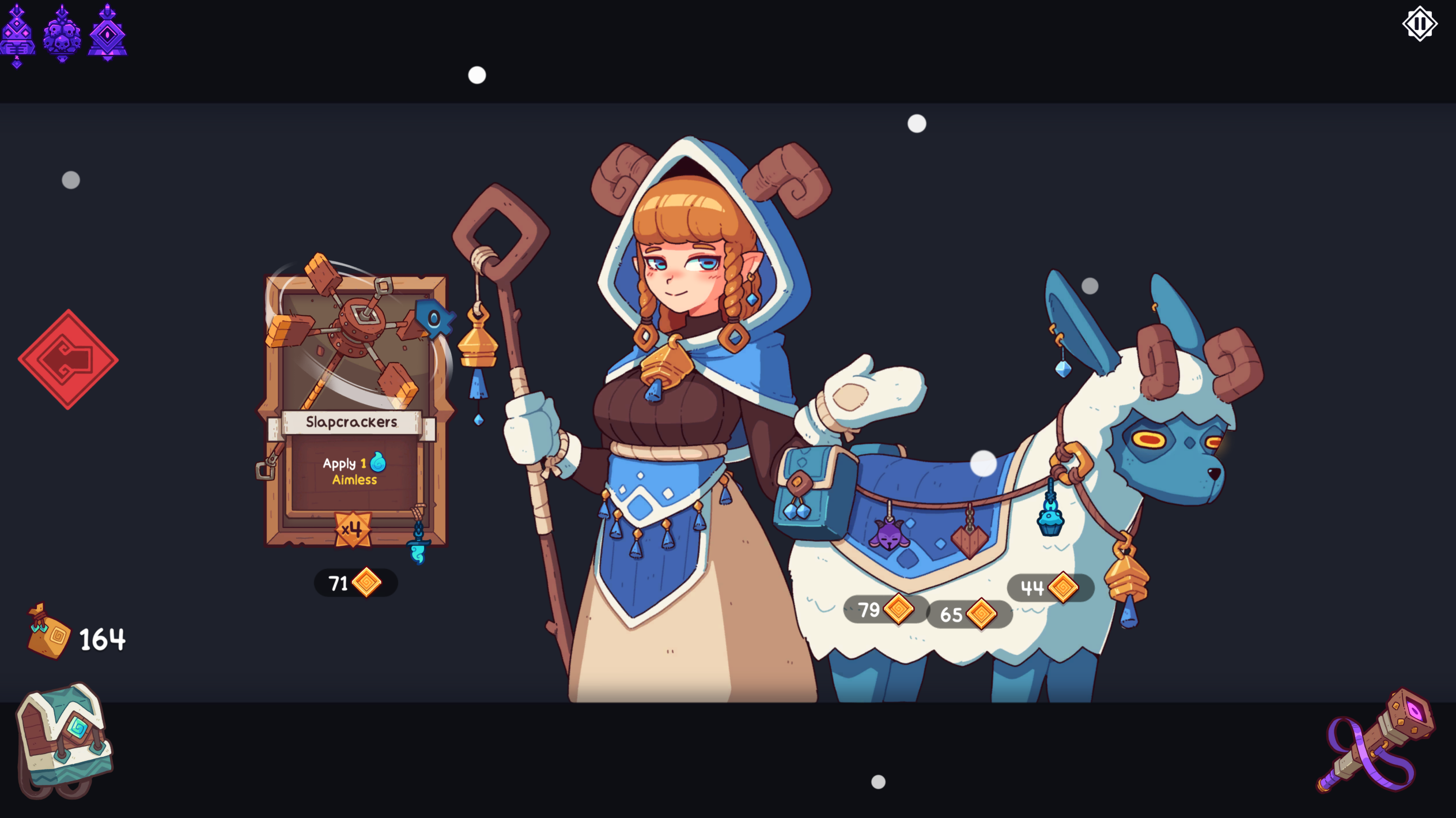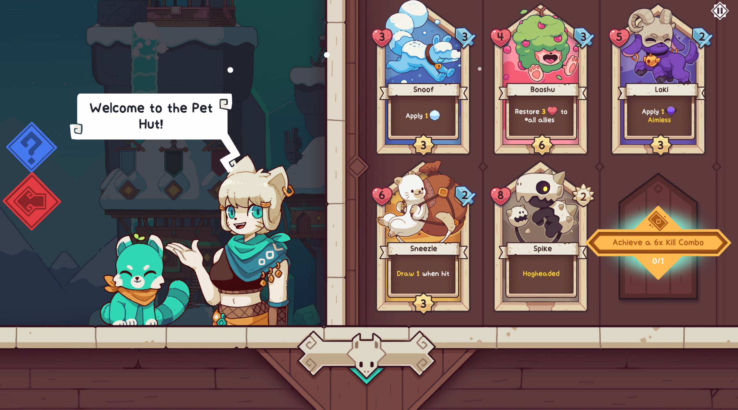 As you play through Wildfrost, you’ll slowly rebuild the town of Snowdell. And as you construct different buildings, like the Pet Hut and the Workshop, Snowdell’s inhabitants will offer you new cards in exchange for completing a few tasks, like achieving combo kills and buying discounted items from the Wooly Snail.