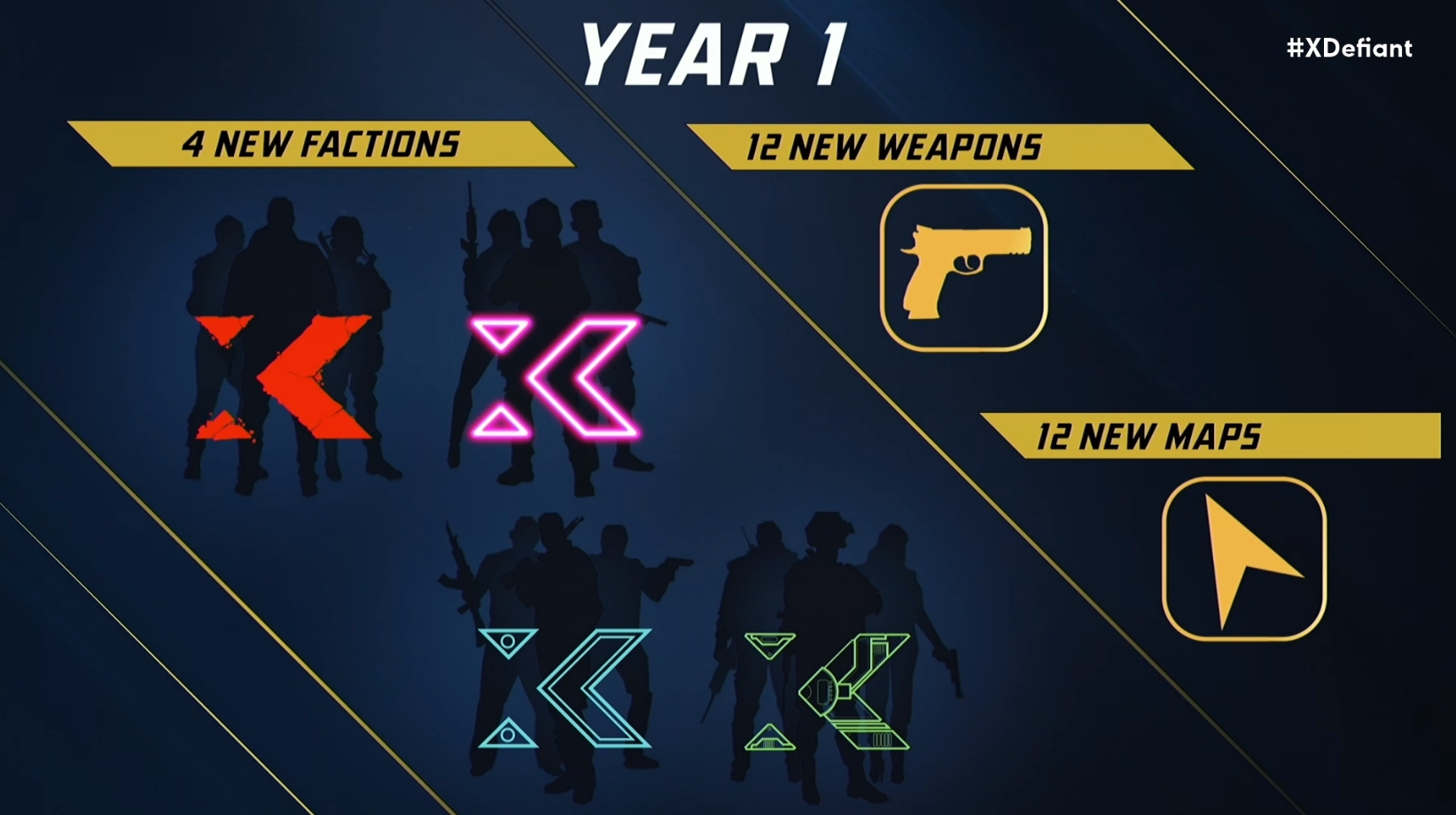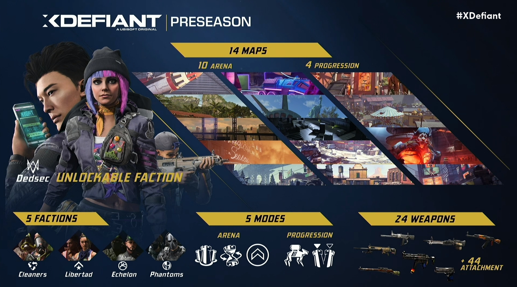The developers also revealed what to expect from the game’s first few months and even its first year. When XDefiant launches “later this summer,” it will begin with a preseason featuring 14 maps, five factions, five modes, and 24 weapons for players to unlock and level up.