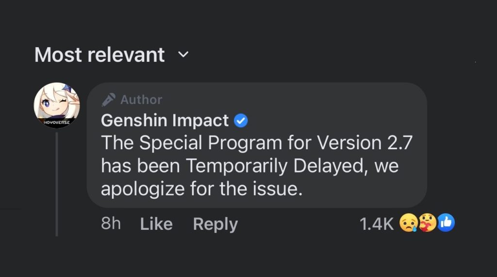 As players flooded the comment section of this post with questions about when the Version 2.7 livestream and release were happening, miHoYo posted a comment revealing that the program has been delayed. “The Special Program for Version 2.7 has been Temporarily Delayed, we apologize for the issue,” the comment reads.