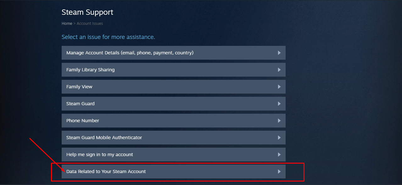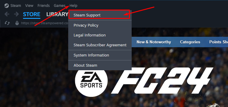 - Click on “Help” and then “Steam Support” if you are on the Steam app or “Support” if you are on the website.