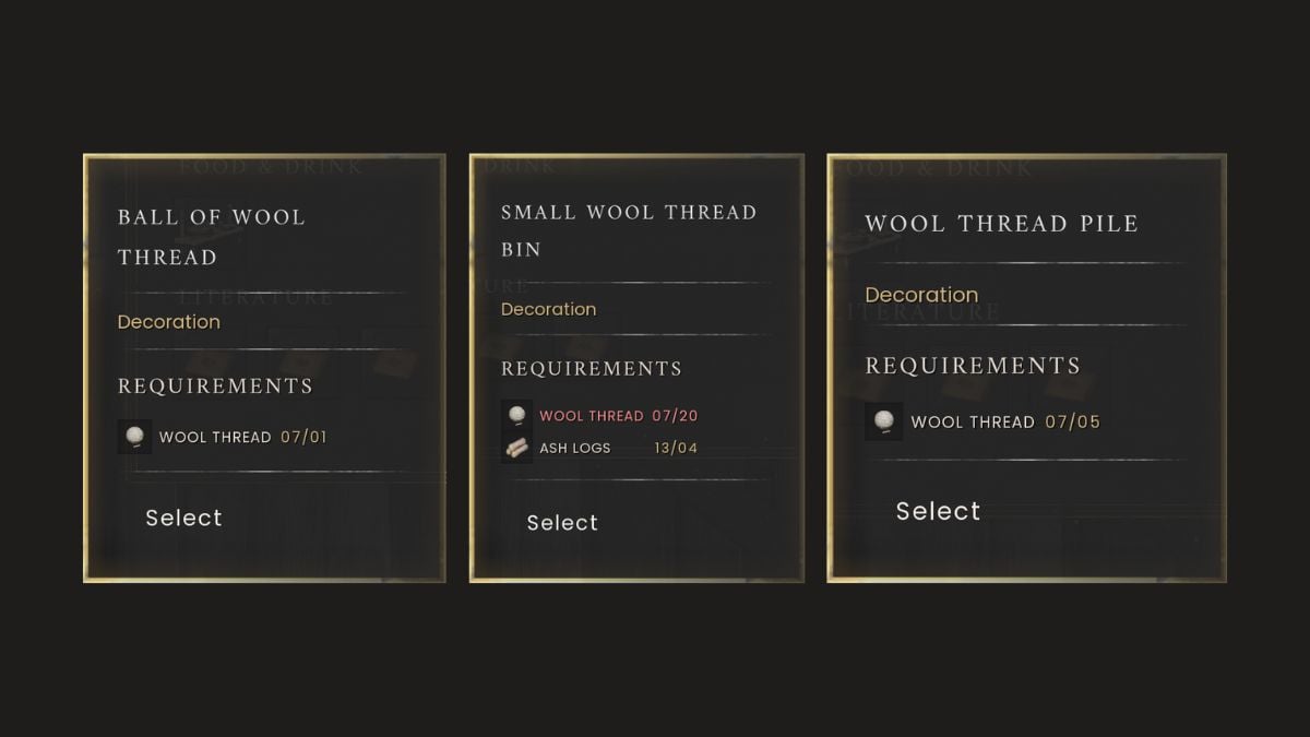 Wool Thread is a material that can be crafted at the spinning wheel after you have acquired either of the following items: