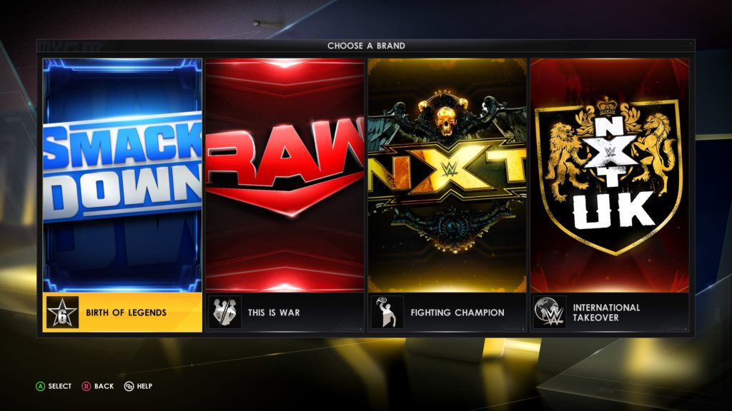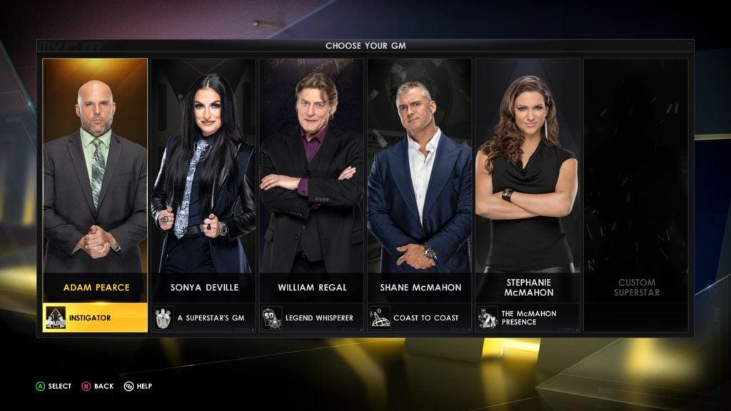 Before you even start selecting superstars, you’ll have to select which brand and which GM you will use. The four brands are Raw, Smackdown, NXT, and NXT UK. There are five choices of GM: Adam Pearce, Sonya Deville, William Regal, Shane McMahon, and Stephanie McMahon. Each promotion and GM comes with its own power card, which you can use to give yourself an advantage.