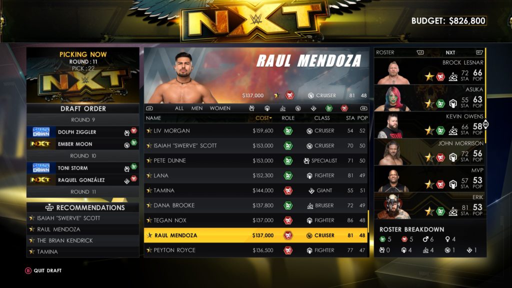 You’ll want to start from the top and work your way down. Your first two picks should be a man and woman that will serve as your inaugural champions: Becky Lynch and Brock Lesnar, Drew McIntyre, and Charlotte, for example. Then pick wrestlers who match well with your top two stars when it comes to class and role, then start building up your mid-card.