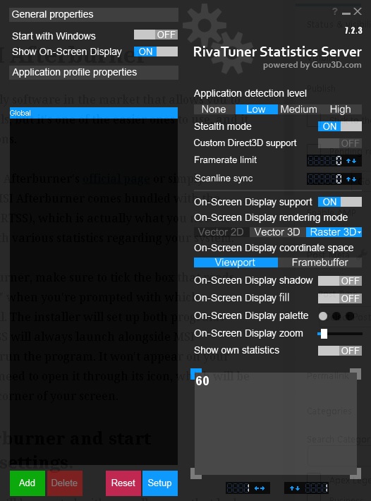 Now that you’ve set everything you need on MSI Afterburner’s panel, you’ll need to make some finer adjustments on RTSS’ interface, which’s the program responsible for the in-game overlay you’ll be seeing.