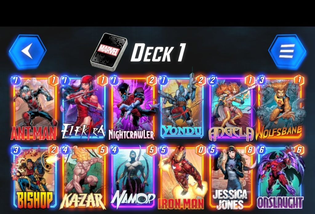 Some of the key cards in this deck include Kazar, which provides a +1 power to every one-cost card. Since this is an Ongoing effect, you can further strengthen Kazar’s granted bonus with the presence of Iron Man, who doubles the total amount of points in the location it is played. Onslaught’s ability to double any Ongoing effect can also be dangerous and can be taken advantage of with cards like Ant-Man.