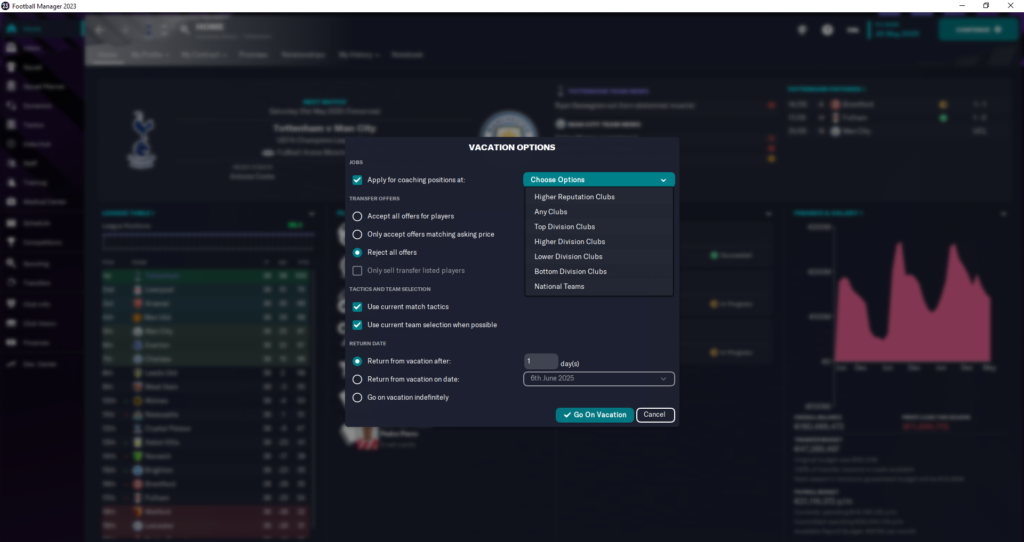 There are several options available for players to customize their vacation during FM23. The ones regarding transfer offers, tactics, and team selection only become available if you’re coaching a team, while the others are available independently of your employment condition in the game.