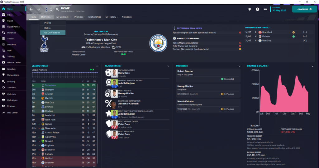 It’s easy to go on vacation in FM23. All you have to do is click “Home” on the left side of your FM23 screen, then move the mouse arrow over “My Profile” and select “Go on Vacation”. Clicking this option will prompt the screen below.