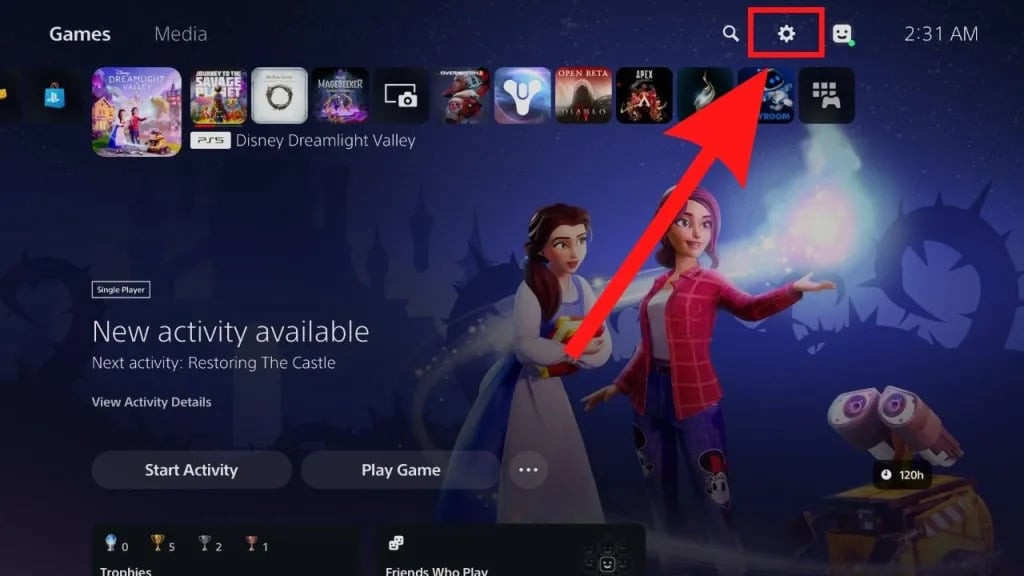 - On your PS5 home screen, select the Settings icon at the top right of your screen—it’s the little gear icon.