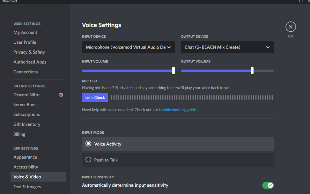 The Voice Settings menu will appear, letting users change their Input and Output Device. Users are focused on changing their Input Device. Select the drop-down box and change the Input Device to “Microphone (Voicemod Virtual Audio Device).” Save the changes and then exit Discord.