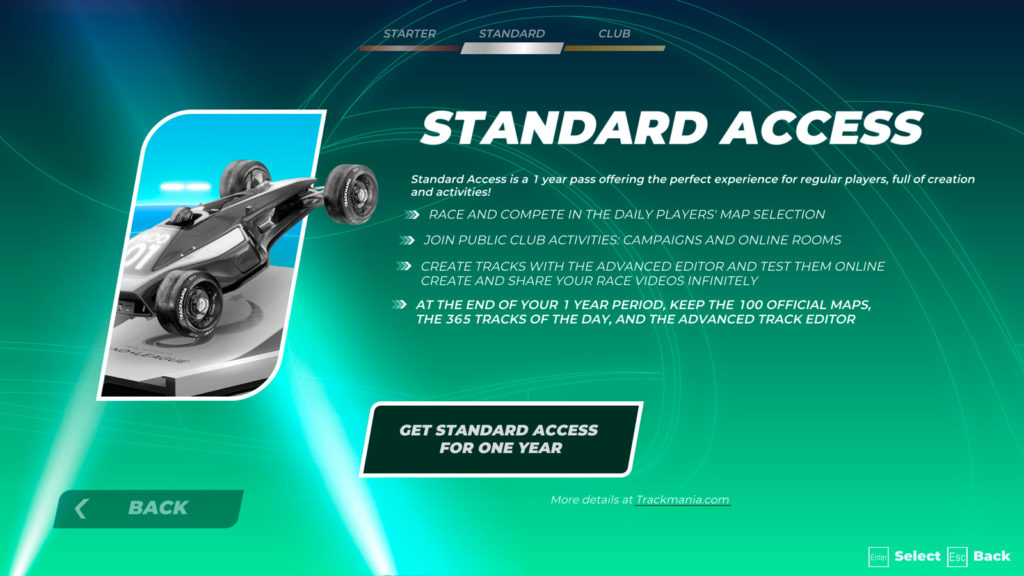 Trackmania offers Standard Access and Club Access to its players for purchase. Standard Access is a one year pass that includes access to the Track of the Day tracks either solo or multiplayer. It also includes access to the full versions of the track and replay editors, as well as public Club activities including campaigns and online rooms. One year of Standard Access costs $10. At the end of the year, players can keep the 100 official maps from the four seasons, the 365 tracks of the day, and access to the advanced track editor. Everything in Starter Access is, of course, included.