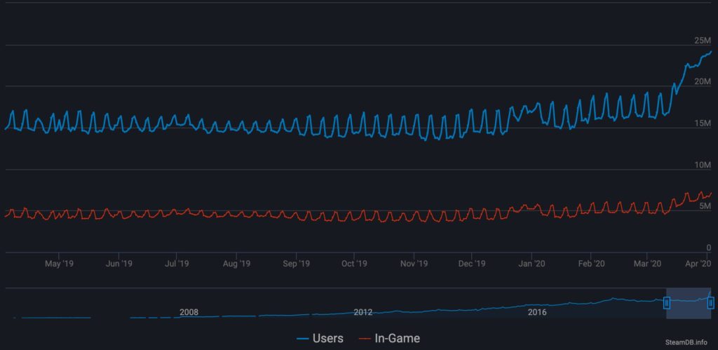 This comes less than a week after Valve’s digital distribution service hit 23 million peak users on March 23, and it looks like the numbers will only keep rising the longer the coronavirus pandemic continues to encourage social distancing.