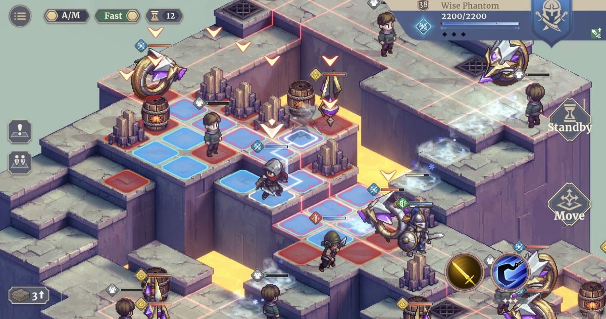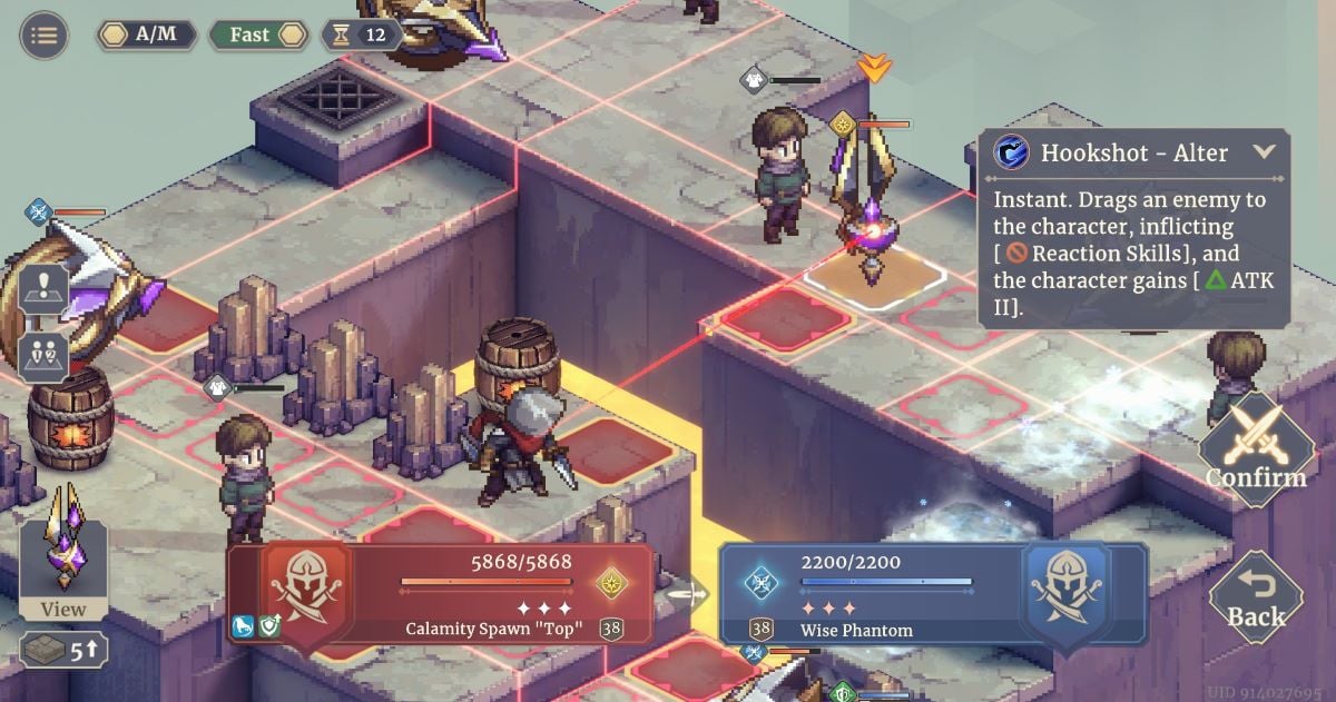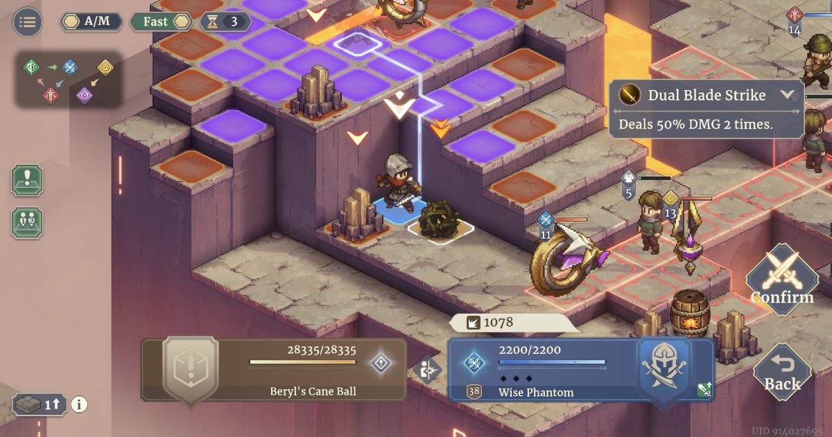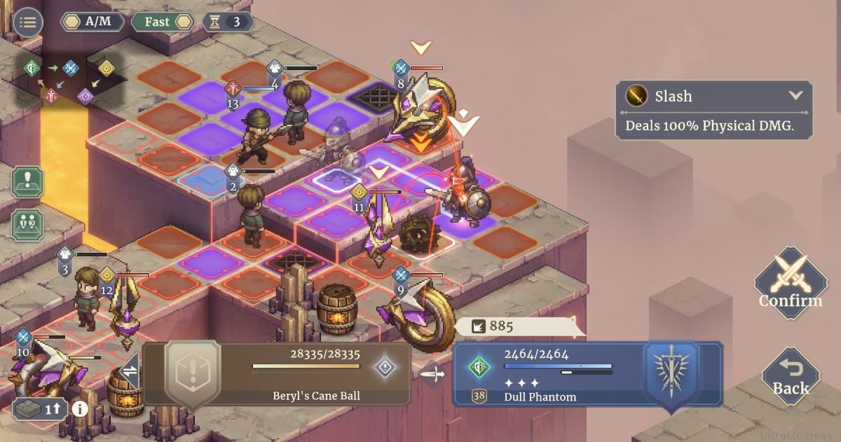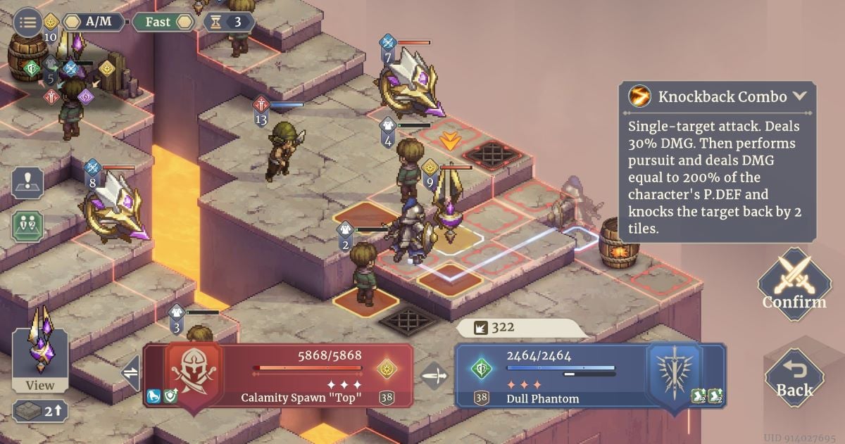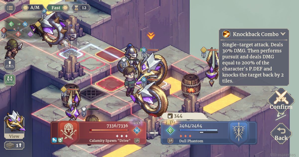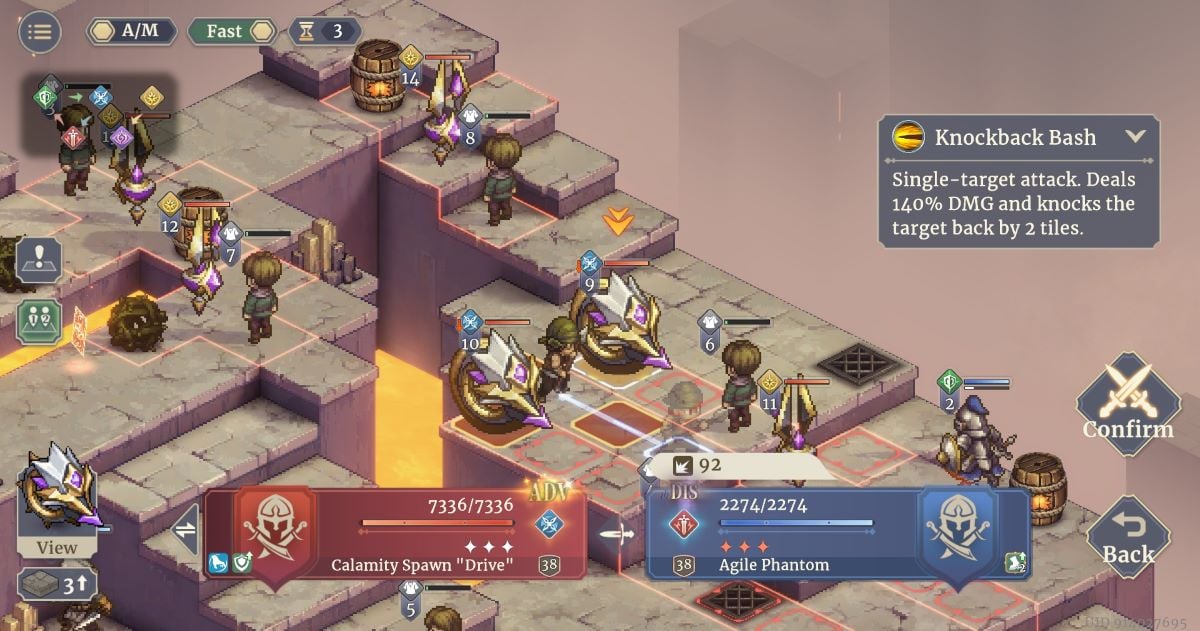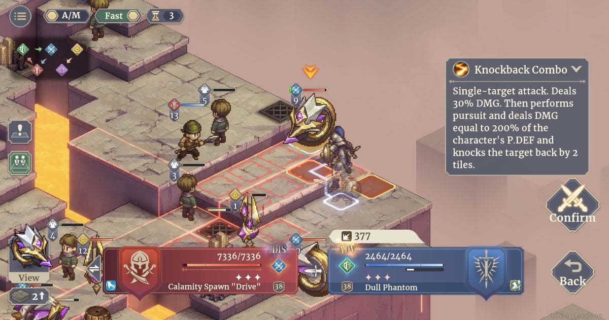 - Send the “Dull Phantom” Defender unit down to the leftmost Drive enemy and use Knockback Combo to push it one tile southeast.