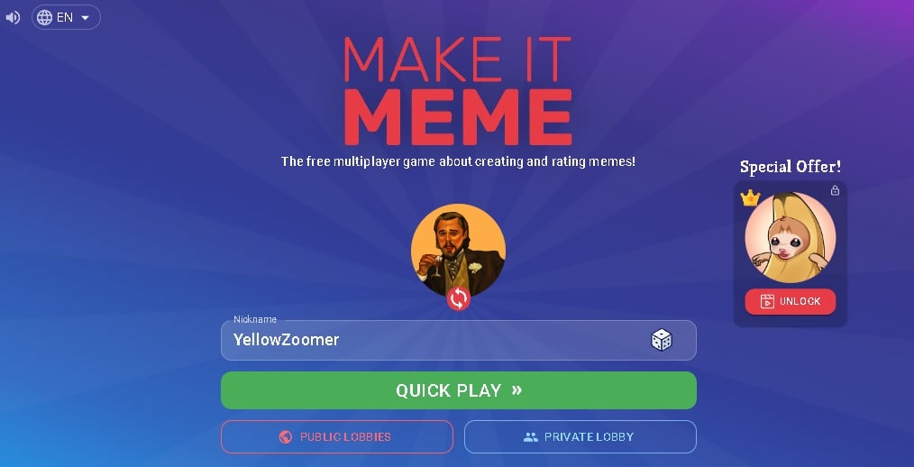 Each round begins with a random meme image which you must caption creatively. After submitting your masterpiece, you’ll vote on other players’ creations. The competition unfolds over three rounds, with the wittiest meme-maker claiming victory and the coveted title of meme champion.