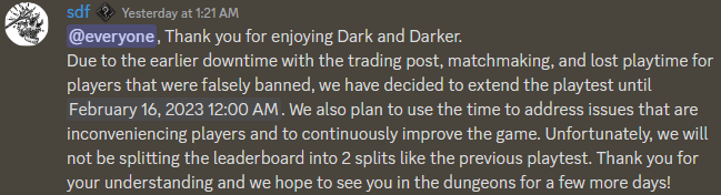 The current Dark and Darker demo was meant to run alongside the Steam Next Fest, which ends on Feb. 13. But the playtest has now been extended, according to the developers from the official Dark and Darker Discord. Here’s what they had to say: