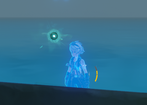 When looking South, you will spot a small orb above the water. When approaching it, a monster will activate, and you’ll need to defeat it. Once it’s done, approach the orb and disperse it using an Anemo attack.