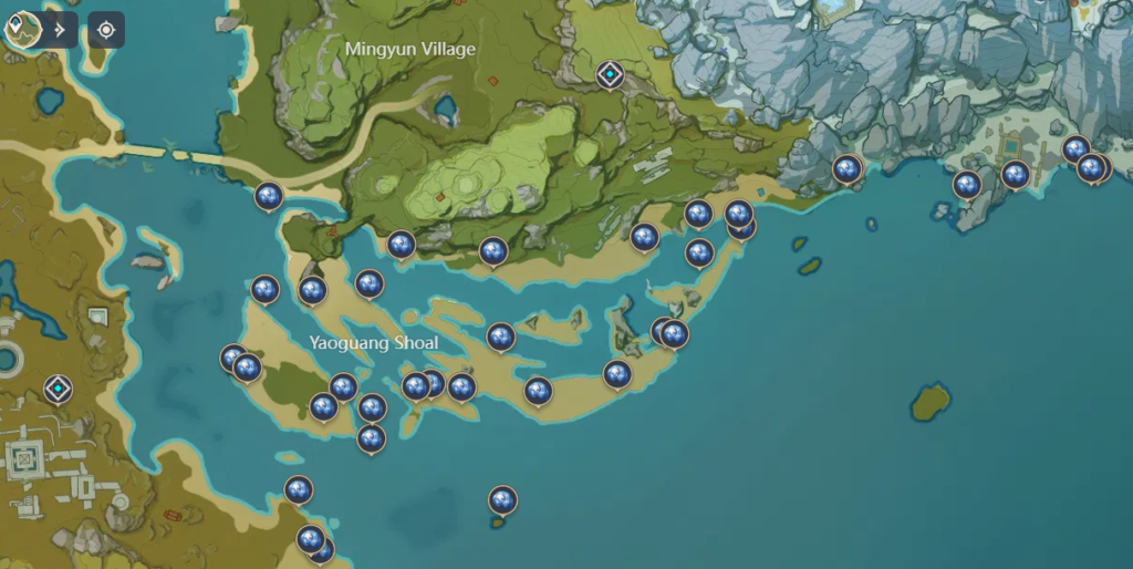 Another spot loaded with Starconch is the area around Yaoguang Shoal to the edges of Dragonspine. This area is a great farming location because the water between the Yaoguang Shoal area is shallow and thus walkable which means that players can traverse around collecting Starconch with ease.