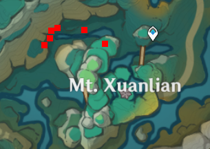 The first Clearwater Jade farming route is around Mount Xuanlian, south of Chenyu Vale. First, teleport to the mountain. You can get there by using a Spirit Carp. Then, glide towards the west and mine the six stones in the area.
