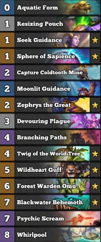 A highlander control deck with Zephrys the Great, it relies on Priest’s incredible survival tools and Druid’s mana cheating to finish off the games. Wildheart Guff is even more powerful in this format than in Standard, and you will look to pull off a wide variety of plays with nonsense amounts of mana to eventually close out the game. Blackwater Behemoth is here to add some much-needed survivability in the early fights.