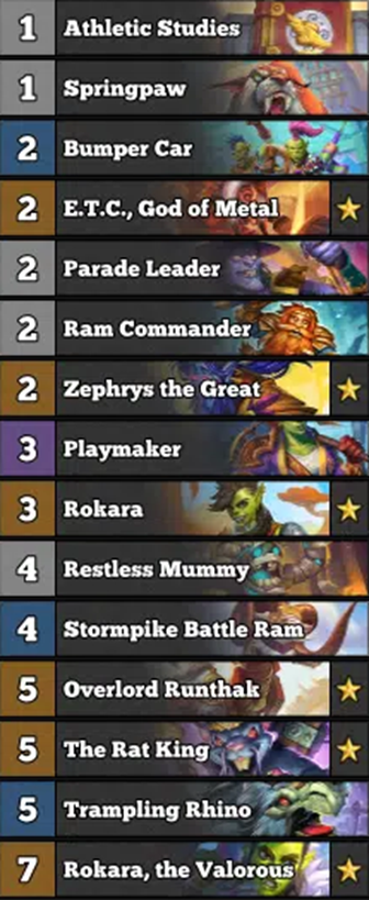 You will rely on strong Rush synergies to keep up on the board and buff tools to eventually get your minions out of range. Rokara and The Rat King will give you great late-game value should it become necessary.