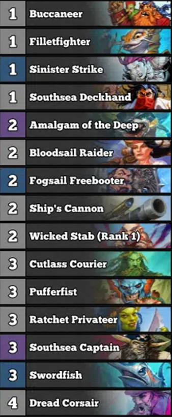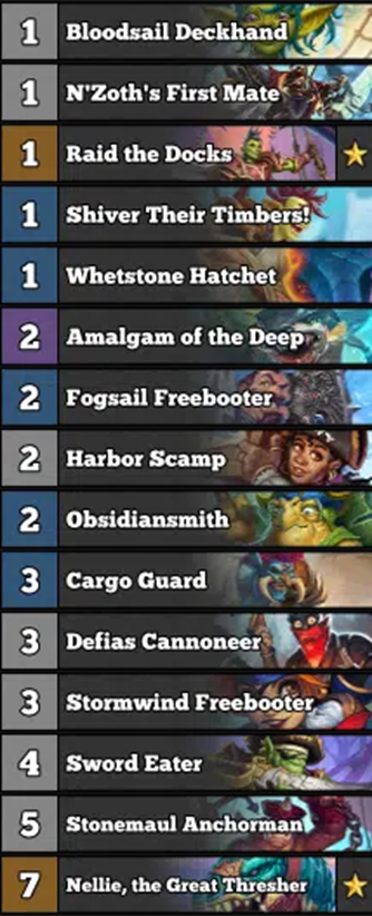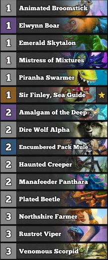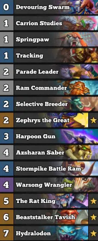 A great midrange deck with insane combo potential courtesy of Harpoon Gun and Hydralodon, Warsong Wrangler and The Rat King, Selective Breeder and Azsharan Saber, and really any combination of these cards. There is also Beaststalker Tavish to provide further staying power. Maximize your power plays and try to highroll with your combos as much as possible and spike your way to victory.