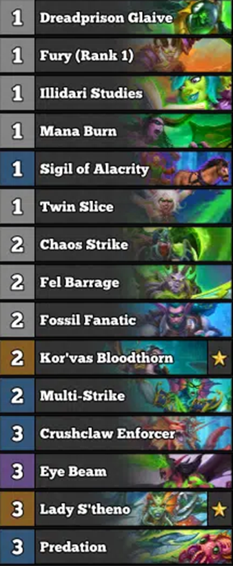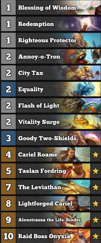 This is a classic control deck that hasn’t changed much in terms of basic strategies since the launch of Duels but it now has much greater card quality to work with thanks to The Leviathan and Lightforged Cariel. It is still one of the weaker classes in the format, but serviceable if this is your favorite to play with!
