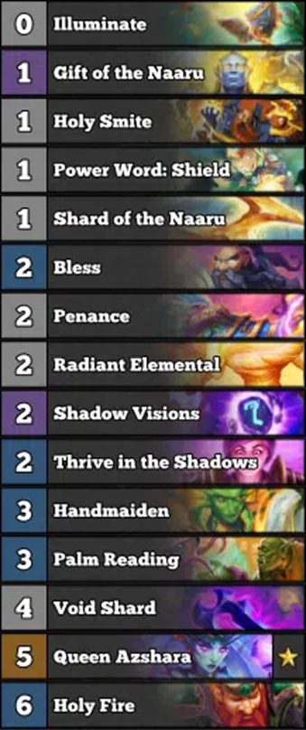 You play an incredible amount of cheap spells to burn your opponent down. Queen Azshara serves as your emergency reserve. Picking up Prophet Velens and Arcane Giants will go a long way to secure your ultimate victory. Board control is an afterthought with this deck: just try to keep things manageable, as you will be the one with inevitability in almost every matchup.
