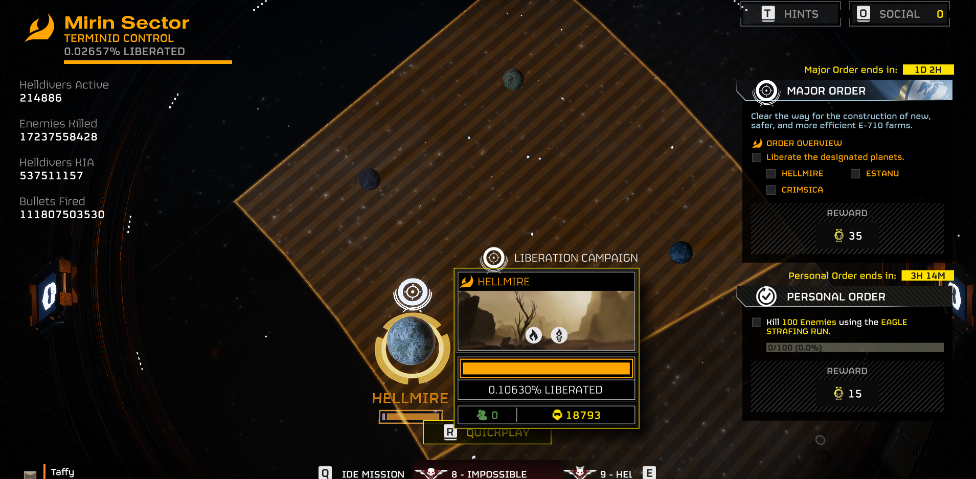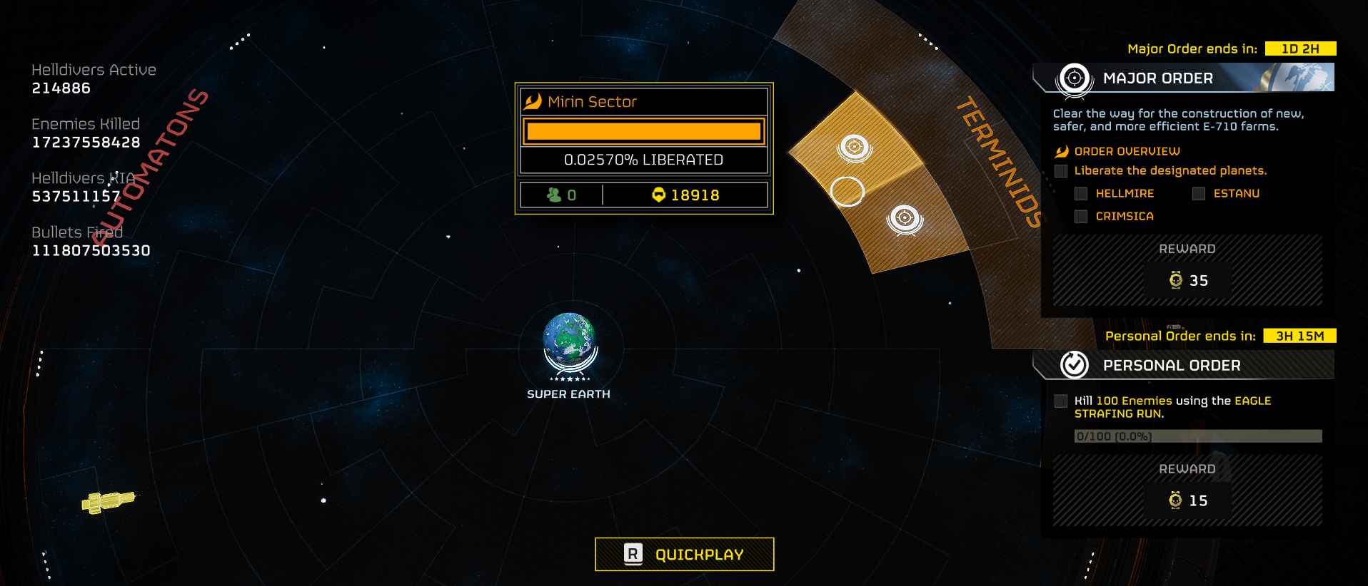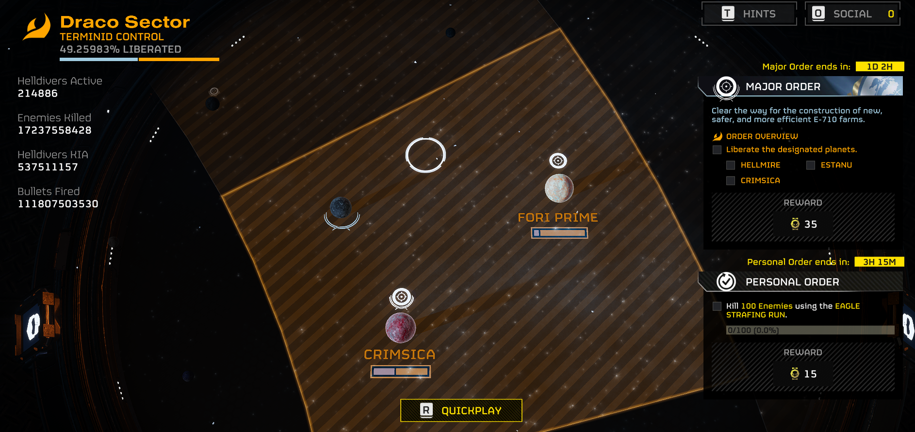To complete this Major Order, we need to liberate Hellmire, which is in the Mirin Sector, and Crimsica and Fori Prime, which are in the Draco Sector. We’ve liberated the planets before but in our absence fighting the Automatons, the pesky bugs are back in force and retook three planets vital to humanity’s success.