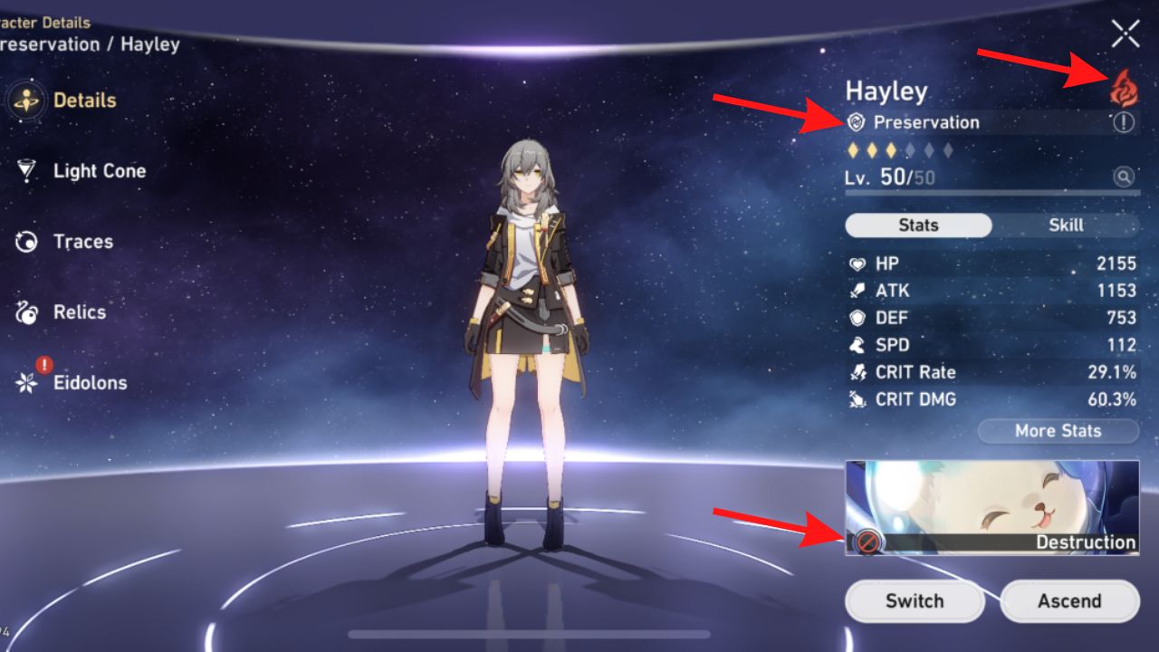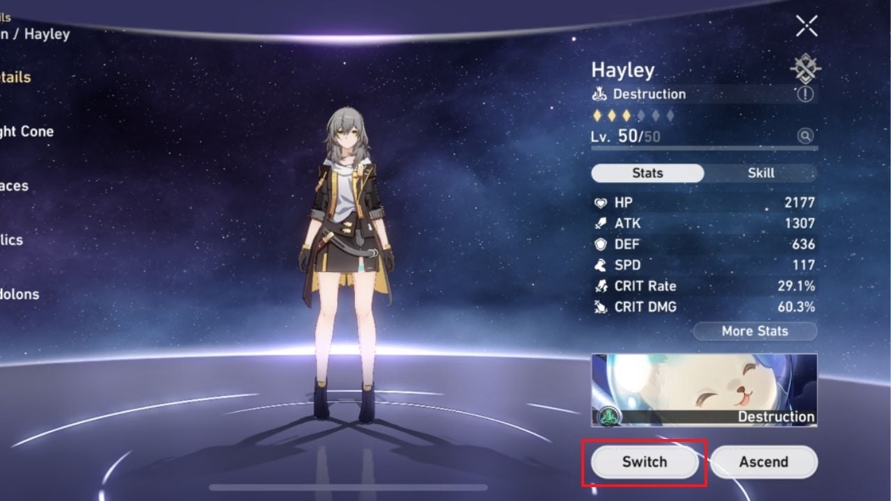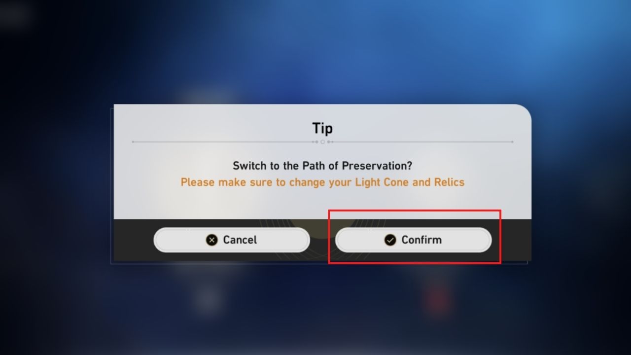 As you’ve changed Paths and combat types, you must equip new Relics and a new Light Cone. And if you’d like to switch back to the Physical Trailblazer, click ‘Switch,” select the Destruction Path symbol, and confirm the changes.