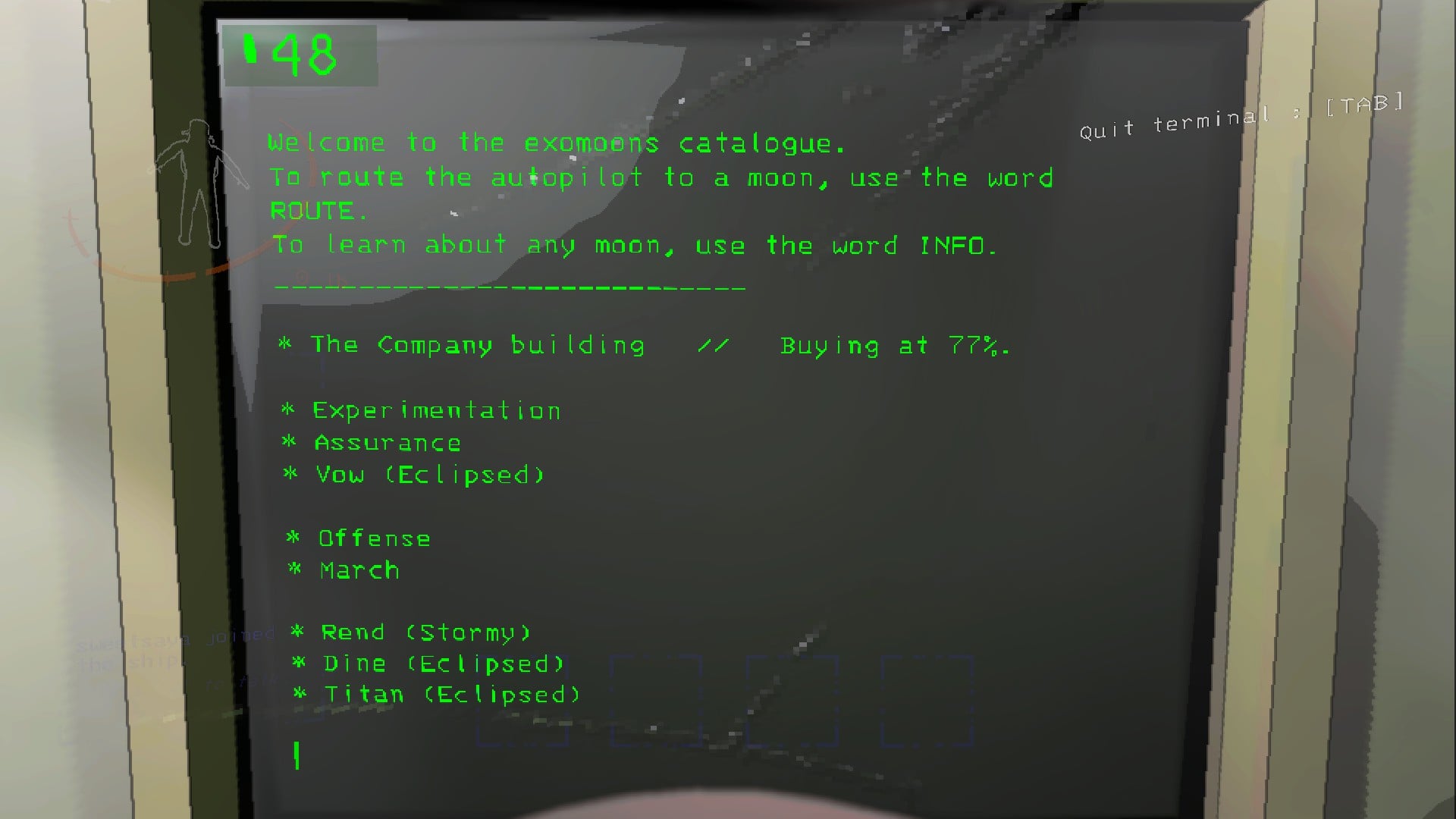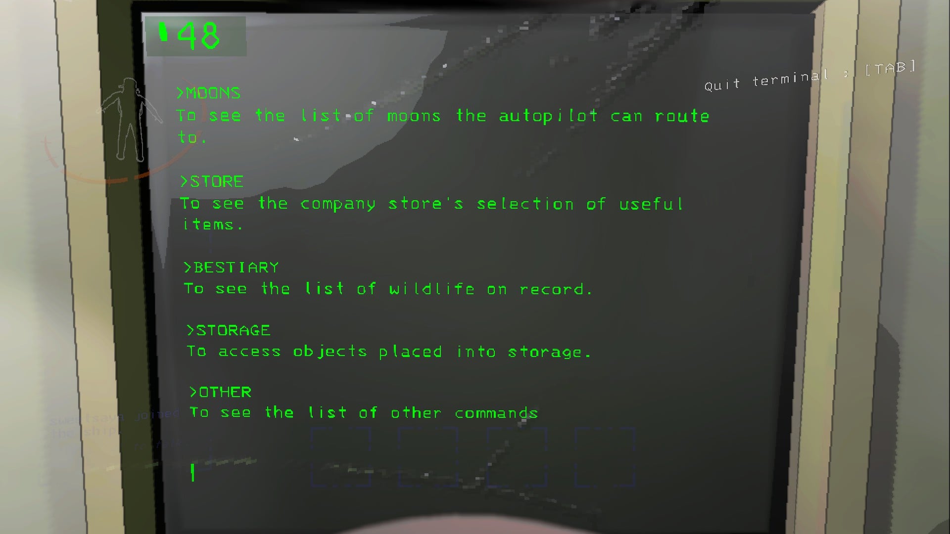 The Terminal is also what you’ll need to use in order to from Moons and the Company building when it is time to sell. To use the Terminal, go up to it and press E to interact. You can exit the Terminal at any point by pressing TAB.