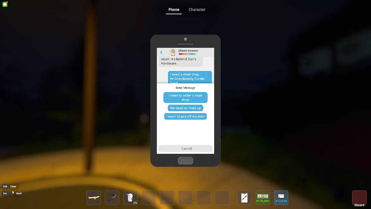 If you do buy excess products you can’t carry, you can keep them in the delivery bay next to the shop and collect them the next time. After the first time you meet him, you can simply text him after a two-day cooldown to meet face to face again for your bulk order in a random spot to get your business growing.