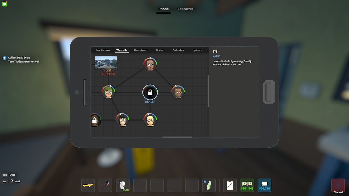 To manage Dealers in Schedule 1, pull out your phone by pressing Tab and select the Dealers app. Yep, there’s an app for that. Here you can see your first Dealer Benji Coleman, followed by Molly Presley in Westville if you have unlocked her. You can track how much money they have made and, most importantly, how much stuff they have left in their inventory, as you should always know that these Dealers work without downtime.
