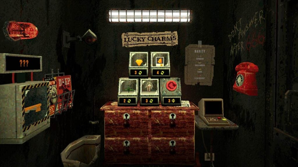 The Buckshot Roulette side, despite having a strategic element, is in its sinister setting. You’re stuck in a room where all you can do is use the slot machine to feed the character’s gambling addiction. The game constantly reminds you what will happen if you don’t earn enough coins, and the recycling bin under the slot machine that contains what seems like human intestines isn’t reassuring either. Devil’s presence is depicted everywhere: on posters, on the phone, and on the slot machine itself.