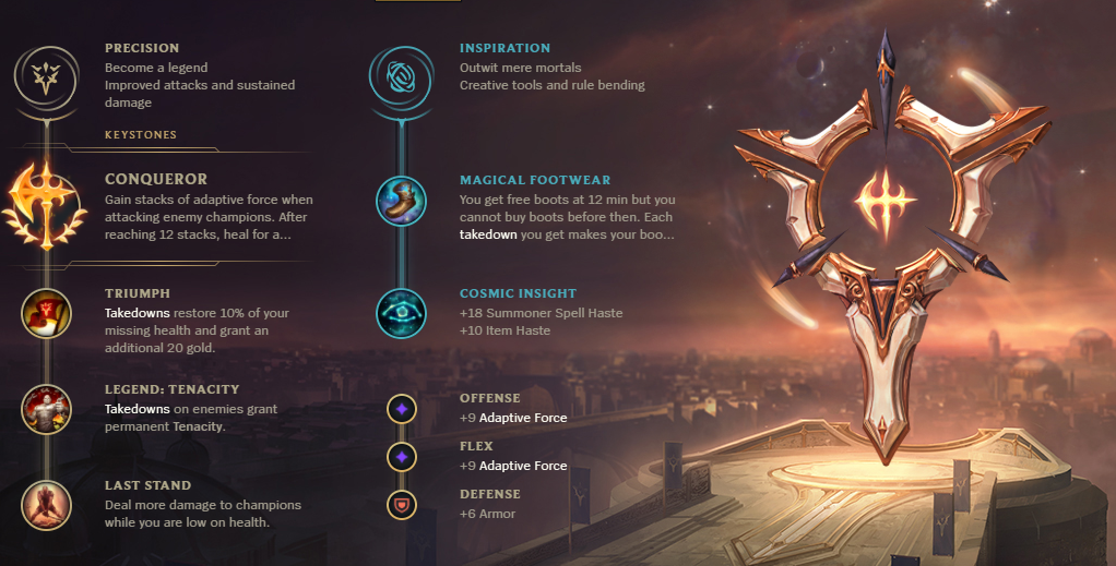 Conqueror: Red Kayn works best during extended teamfights thanks to its sustain-based kit and reposition with his E and ultimate. With that in mind, there is no better option than Conqueror from the Precision tree. It increases his adaptive force when casting spells and auto attacks, and it grants additional healing at max stacks. While it’s not a game-changer, it further fuels Kayn’s skirmishing ability.