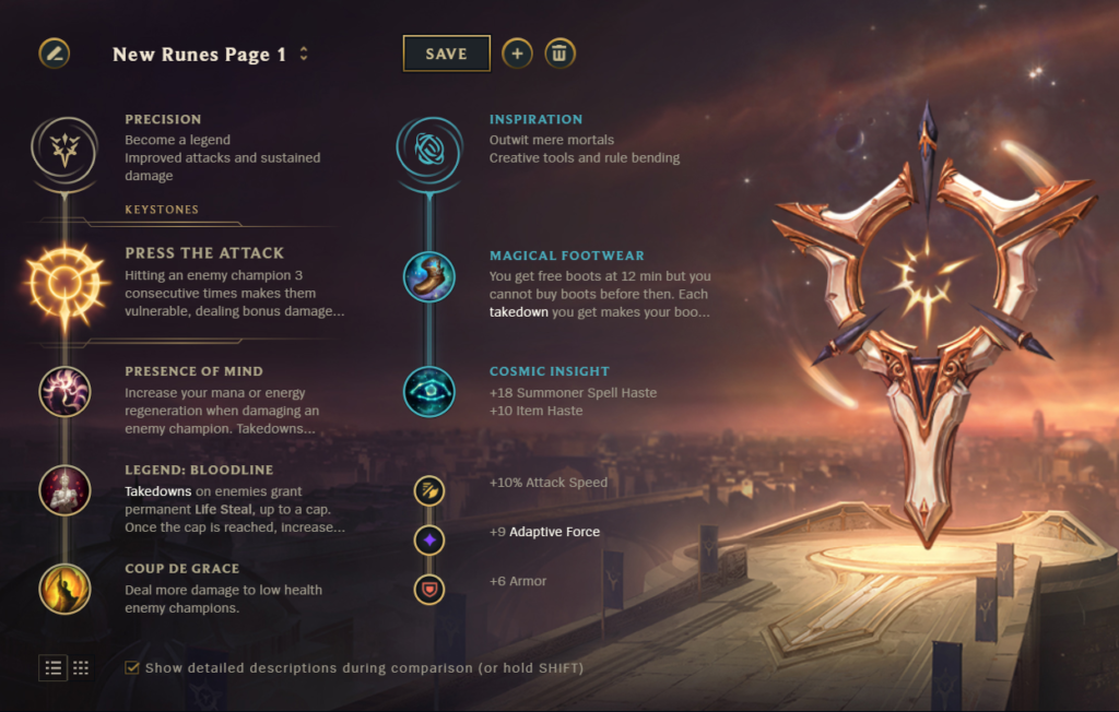 Press the Attack: compared to First Strike, Press the Attack gives Lucian more skirmishing potential in the early game. The rune synergizes well with the ADC’s passive Lightslinger and it works best in extended trades.