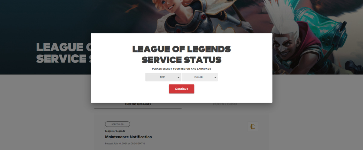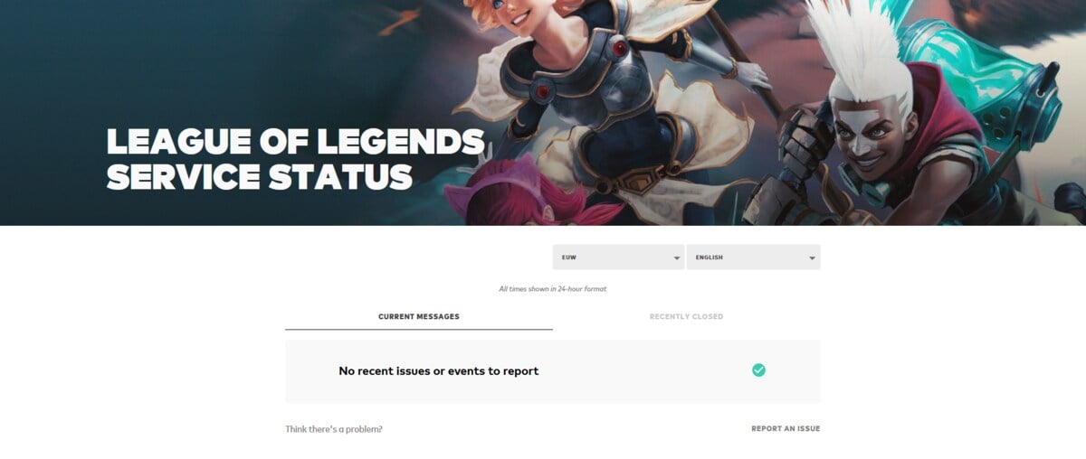 Riot has a landing page for its server status website, which offers access to all five titles, including League. Select League, and then choose which region you want to check the status for. Once you have selected your region, you can see the server status for the past 24 hours. The message “No recent issues or events to report” will appear if the servers work fine.