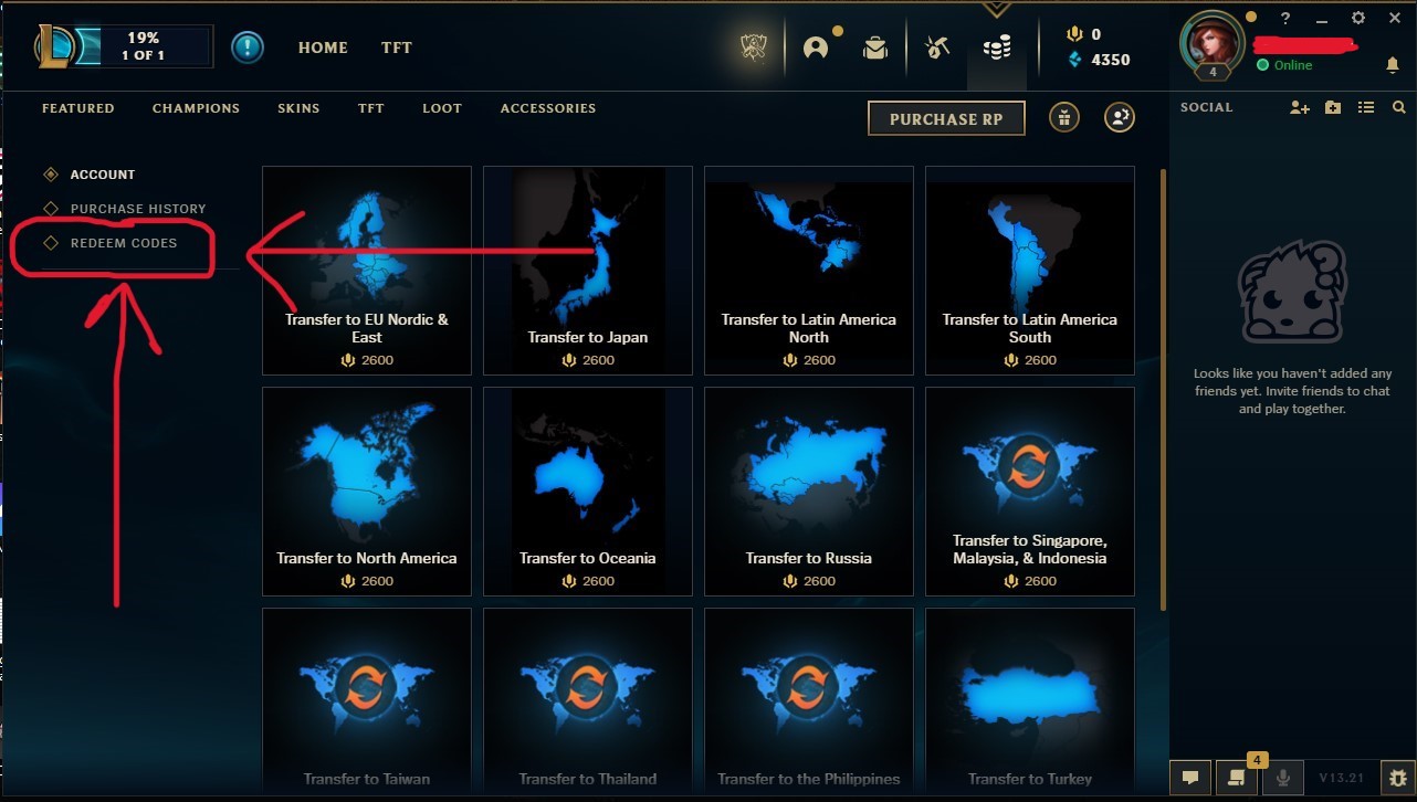 - You’ll see a huge window showing you different regions where you can transfer to. Ignore this and instead look at the leftmost tab. Find the Redeem codes option and select it.
