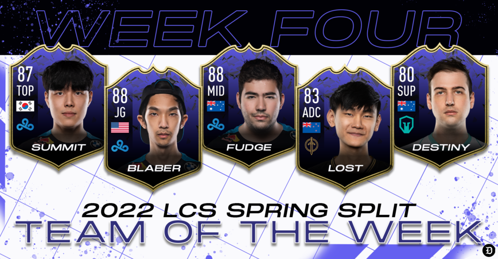 Some League of Legends teams are thriving with their new environments, while others are floundering at the bottom of the standings. Throughout this season, one team has been consistently thrust into the spotlight: Cloud9. These past three games brought similar results for the best team of the superweek as they swept through with perfect results, and are represented well in this edition of Dot Esports’ LCS Team of the Week for week four.