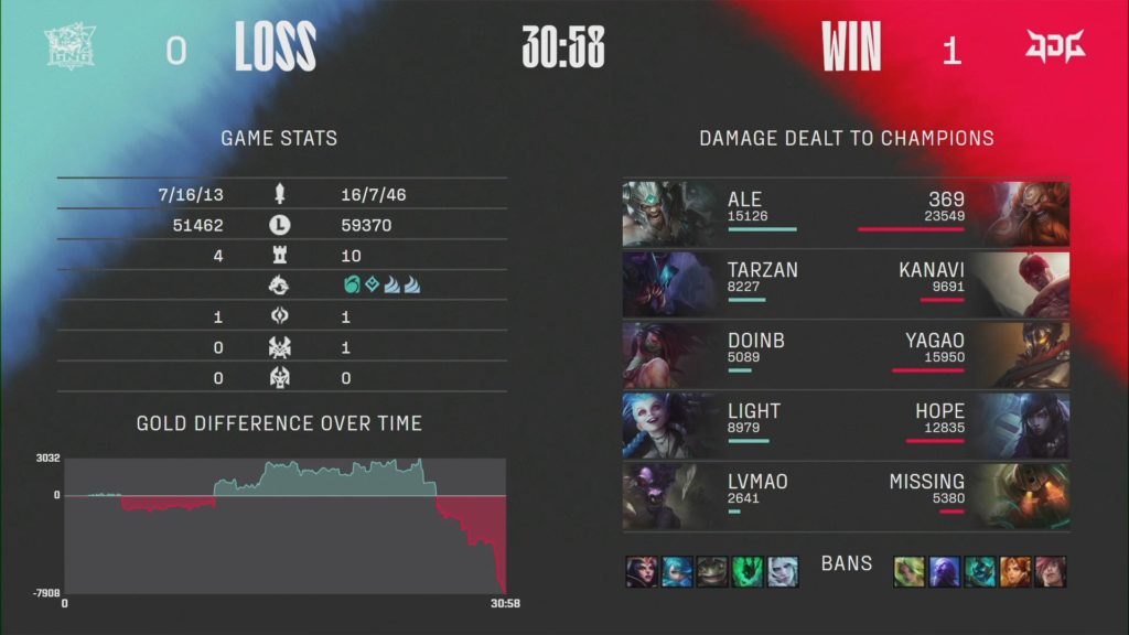 Both games followed the same pattern where LNG held a slight 3,000 gold advantage over JDG throughout the majority of the game. And when it looked like LNG would run away with the game, JDG would come away with the team fight which snowballed the game.
