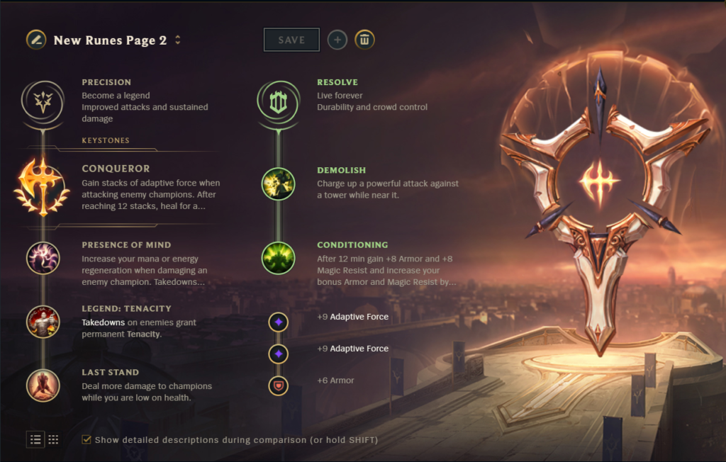 Conditioning: You choose it for the same reason explained with the Conqueror rune setup: it synergizes well with the long fights she tends to get involved in.