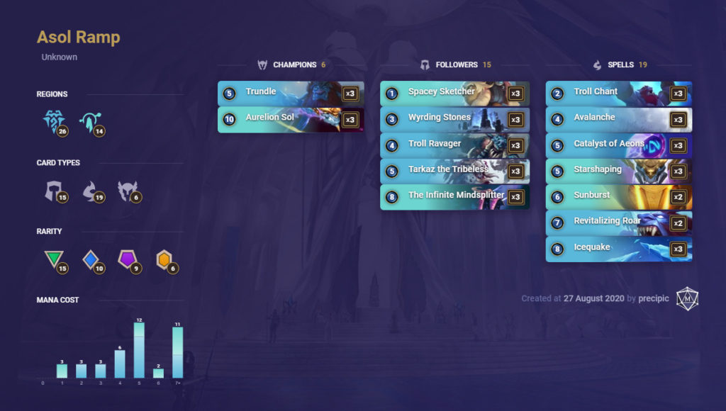 Off the beaten path while a solid deck worth trying is Sailor Moon by ZeroInfinity. He hit Master rank using only Targon builds that included Nightfall and Leona/Lux.