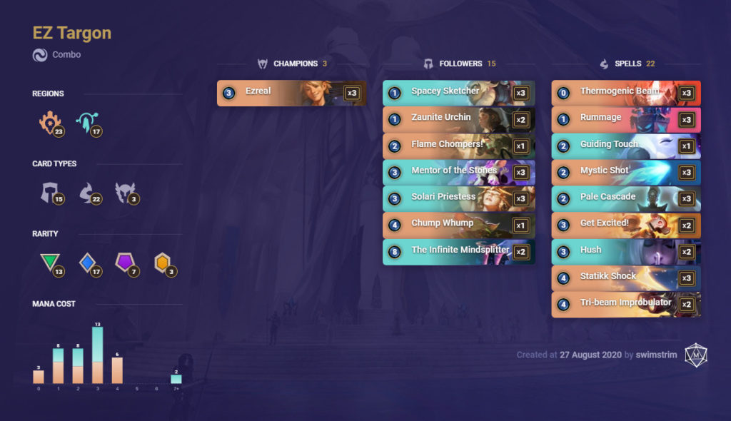 Similar to previous Ezreal combo builds, the goal is to level him up by shutting down your opponent until the late combo comes online. It’s one of the best decks out in the meta and ideal for players who enjoy strategic complexity with the reward of an ultimate combo bonanza.