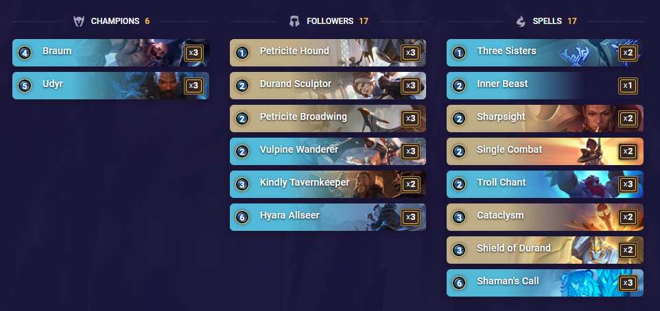 Using mostly the Wildclaw Stance that grants an ally +2/+0 and Overwhelm, along with Boar Stance for +0/+2 and Regeneration, the Demacia and Freljord deck can stall until your units go over the top with lethal Overwhelm damage. A full guide on how to play the Udyr and Braum deck can be found here.