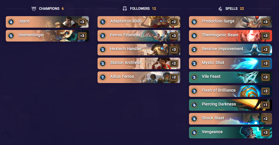 This Jayce and Heimerdinger Control deck was created by Zenaton, using the Shadow Isles region for Control via spells like Vengeance, Piercing Darkness, and Vile Feast. The rest of the LoR deck uses cards from the Piltover and Zaun region. Hextech Handler is the star of the show, according to Zenaton, and they have included the spell Iterative Improvement to copy either Hextech Handler or Ferros Financier, along with your opponent’s stuff as well when needed.