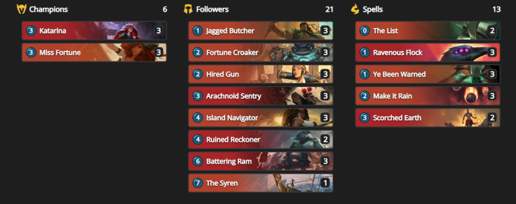 Created by Snnuy, the Katarina and Miss Fortune LoR build is a “very aggressive combo deck.” Units like Jagged Butcher, Fortune Croaker, and Hired Gun set up the early game for Miss Fortune. Once the board state has been established via Miss Fortune, according to Snnuy, the strategy shifts over to multiple Scout attacks, Rally, and effects from the Bilgewater spell, The List.