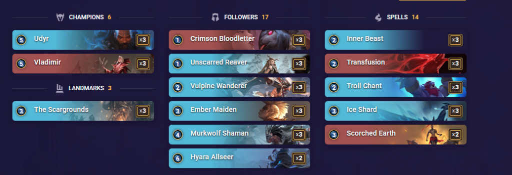 The TempoMaou Udyr and Vlad LoR deck doesn’t shy away from combat tricks, containing three copies of Inner Beast, Transfusion, and Troll Chant. Unscarred Raver and Vulpine Wanderer get the ball rolling during the early game, making room for Murkwolf Shaman and Hyara Allseer during the late game.