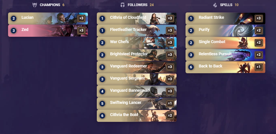 While the deck does mainly feature Zed as the non-Demacian card set, you can look into adding other early-game based champions from other regions. The most adjacent unit would be an Elise since she’s similarly evasive to Zed early (with Fearsome instead of Quick Attack) and she spawns tokens to absorb a Vanguard Bannerman buff or fuel a Vanguard Redeemer or Lucian Level up.
