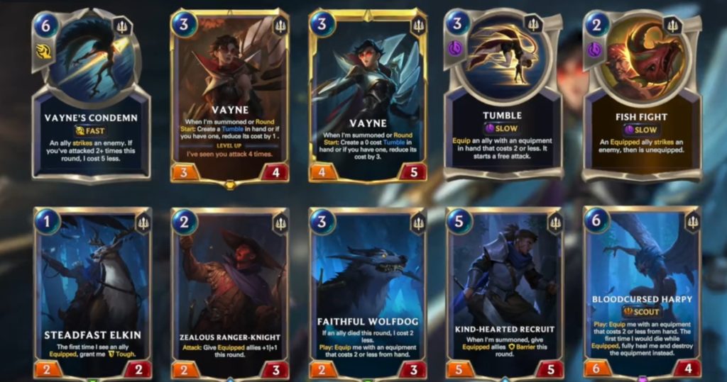 The standout support follower for Vayne is Faithful Wolfdog, a three-cost 2/3. If an ally died during that round, Faithful Wolfdog only has a mana cost of one. And upon getting played, the wolf is equipped with an Equipment from hand that costs two or less.